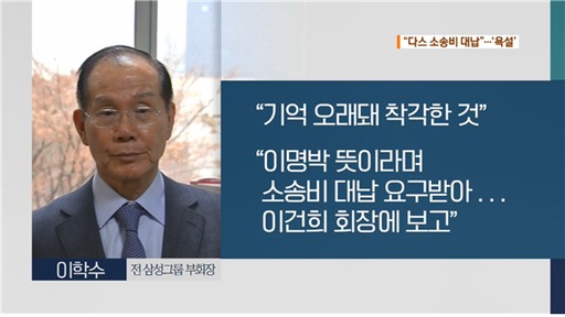 이날 이학수 전 부회장은 이 전 부회장은 삼성이 자동차부품업체 다스(DAS)의 미국 소송비를 대납한 경위를 증언했다. 이명박 전 대통령의 뇌물수수 혐의는 1심에서 유죄로 인정.