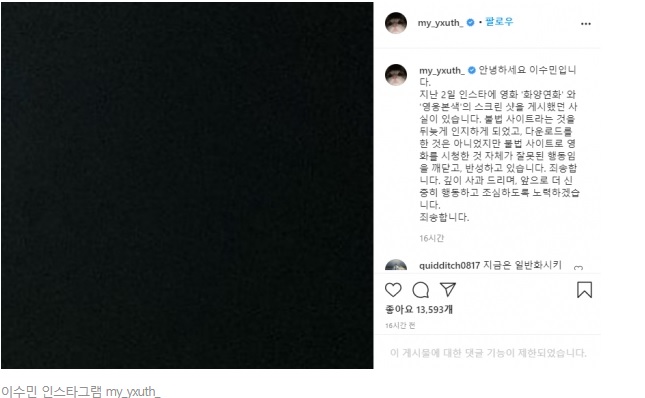 배우 이수민이 불법 사이트를 통해 영화를 시청한 것에 대해 사과했다.
