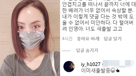그리고 이어 홍인영의 지인은 "기간이 겹치고 안 겹치고를 떠나 끝까지 너에 대한 배려가 너무 없어서 속상할 뿐. 다 털어버려 인영아. 너도 새출발 고고"라고 응원 메시지를 남겼다. 이에 홍인영은 "이미 새출발중♥"이라고 연애를 암시하는 듯한 댓글을 남겼다. 또 다른 지인이 "이제 좋은 일만 있을 거야"라고 댓글을 달자 "고마워. 더 행복해 나는"이라고 답하기도 했다.
