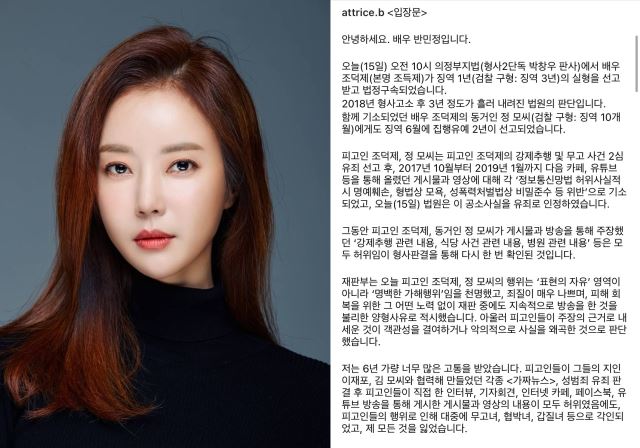 그러면서 "저는 6년 가량 너무 많은 고통을 받았다. 피고인들이 만들었던 각종 '가짜뉴스'와 게시물, 영상의 내용이 모두 허위였음에도 피고인들의 행위로 인해 대중에 무고녀, 협박녀, 갑질녀 등으로 각인됐고 모든 것을 잃었다"면서 "법적 대응을 하는 과정에서 수차례 자해를 했고 신체적·정신적으로 무너졌으며, 모든 삶이 흔들렸다. 그럼에도 끝까지 버틴 것은 법으로라도 허위사실임을 인정받기 위한 것에서 나아가, 다른 성범죄 피해자들에게 살아만 있으면 언젠가는 진실이 밝혀진다는 희망이 되고 싶다는 마음이었다"고 심경을 전했다.