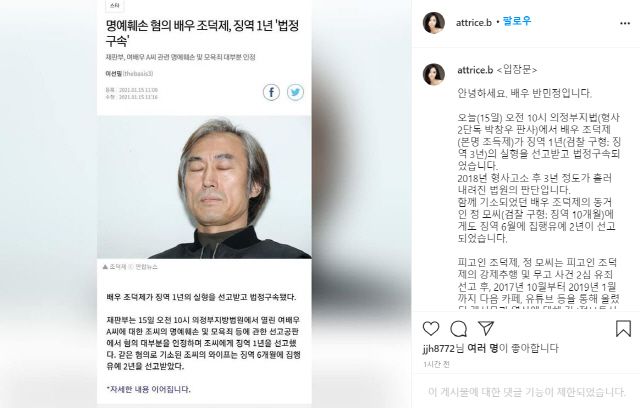 영화 촬영 중 여배우를 강제추행한 혐의로 대법원에서 집행유예를 선고받았던 배우 조덕제 씨(53)가 피해자의 명예를 훼손하는 글을 인터넷에 올린 혐의 등으로 실형을 선고받고 법정 구속됐다.