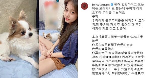 그리고 앞서 10년 동안 함께한 반려견을 떠나보낸 트와이스 멤버 쯔위가 유기견 두 마리를 임시 보호하고 있다는 근황을 전해 훈훈함을 안겼다. 지난 9월 쯔위는 10년 넘게 함께 했던 반려견 '구찌'를 먼저 떠나보냈다.