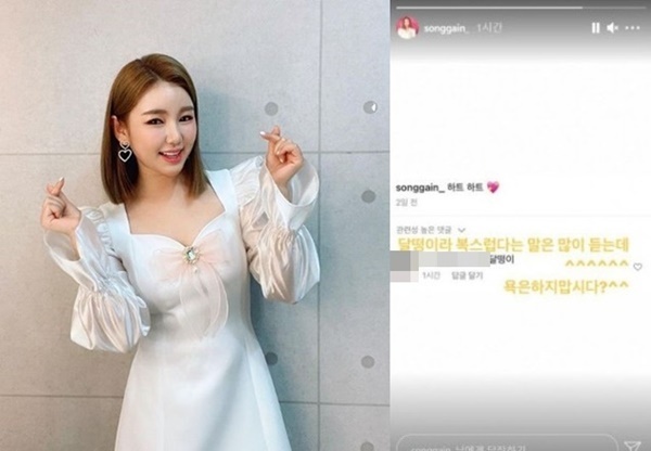 송가인은 25일 자신의 인스타그램 스토리에 한 악플러가 남긴 댓글을 캡처해 게재했다. 지난 23일 송가인이 업로드한 근황 사진에 한 악플러는 “미친X 달떵이”라는 외모를 비하하는 댓글을 달았고, 이를 본 송가인은 해당 댓글을 캡처한 후 “달떵이라 복스럽다는 말은 많이 듣는데^^ 욕은 하지 맙시다?^^”라고 코멘트를 달며 일침을 가했다.