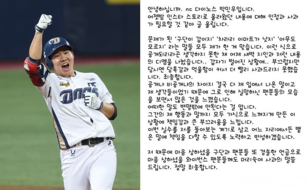 박민우는 28일 인스타그램에 “어젯밤 올라온 내용에 대해 인정과 사과가 필요할 것 같다”며 “문제가 된 ‘구단이 갑이지’ ‘차라리 이마트가 낫지’ ‘아무도 모르지’라는 말들은 모두 내가 한 게 맞다. 이런 식으로 공개될 것이라고는 생각하지 못하고 전날 새벽 지인과 다이렉트 메시지를 주고받았다. 갑자기 벌어진 상황에 부끄럽지만, 당시엔 당혹감과 억울함이 커 빠르게 사과하지 못했다. 죄송하다”고 적은 사과문을 올렸다.