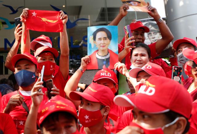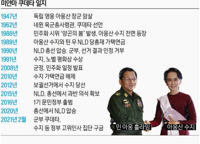 한편 미얀마 민주화 운동의 상징인 수치 고문이 이끄는 NLD는 2015년 총선에서 압승하면서 1962년 네윈의 쿠데타 이후 53년 동안 지속한 군부 지배를 끝냈다. NLD는 지난해 11월 열린 총선에서도 전체 선출 의석의 83.2%를 석권하며 승리해 '문민정부 2기'를 열었다.