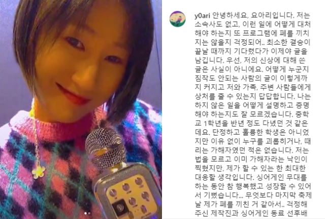 JTBC '싱어게인-무명가수전'을 통해 얼굴을 알린 가수 요아리가 학교 폭력 의혹에 대해 직접 입장을 밝혔다.