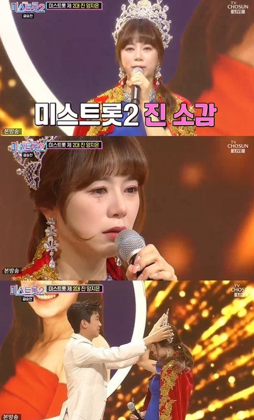 그리고 '미스터트롯' 진인 임영웅에게 왕관을 받은 양지은은 "몇 등이 되던 울지 않겠다고 다짐했다"며 "동료들 모두 함께 고생했고 7명 모두 잘 하는 친구들이라 축하해주고 싶다고 마음을 먹었기 때문"이라고 울먹이며 수상 소감을 밝혔다.이어 "큰 상을 주셔서 감사하다"며 "시청자 여러분의 사랑 덕이라고 생각한다. 진에 걸맞은 좋은 가수가 되어 위로 드릴 수 있는, 감동을 드릴 수 있는 좋은 노래 많이 들려드리겠다"고 덧붙였다.