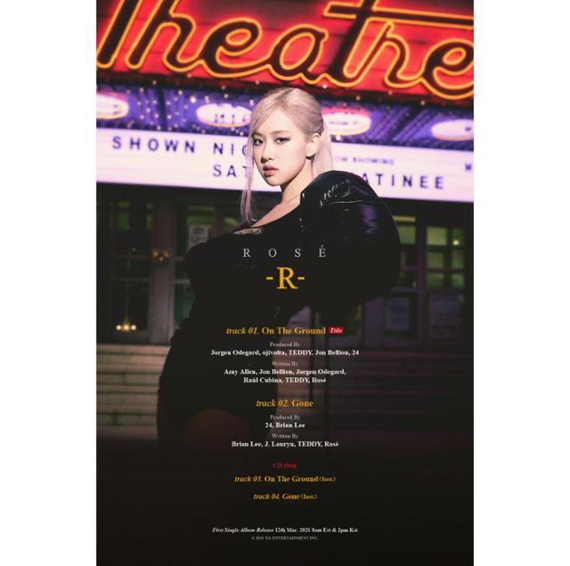 로제의 첫 솔로 앨범 'R' 음원은 오는 12일 0시(미국 동부시간 기준), 같은 날 오후 2시(한국시간 기준) 공개된다. 타이틀 곡 'On The Ground'는 신비로운 사운드의 악기 편곡, 시원한 드롭 파트, 로제의 유려한 보컬이 특징인 곡이다.