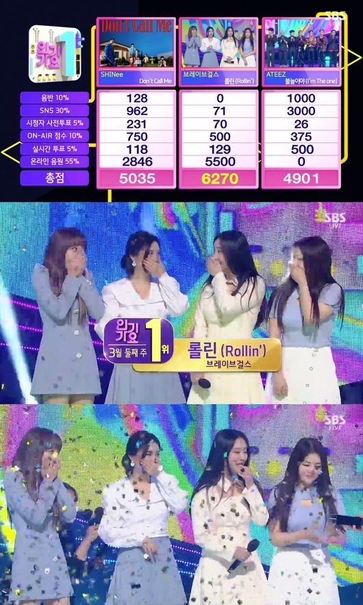 14일 오후 방송된 SBS ‘인기가요’에서 브레이브걸스는 ‘롤린’으로 샤이니와 에이티즈를 제치고 3월 둘째 주 1위에 올랐다. 이날 브레이브걸스는 1위 가수로 호명되자 감격의 눈물을 흘렸다. 민영은 “해체 위기에 놓여서 다시는 무대에 못 설 줄 알았는데 큰 사랑을 주셔서 감사하다. 멤버들도 버텨줘서 고맙다”라고 말했다.