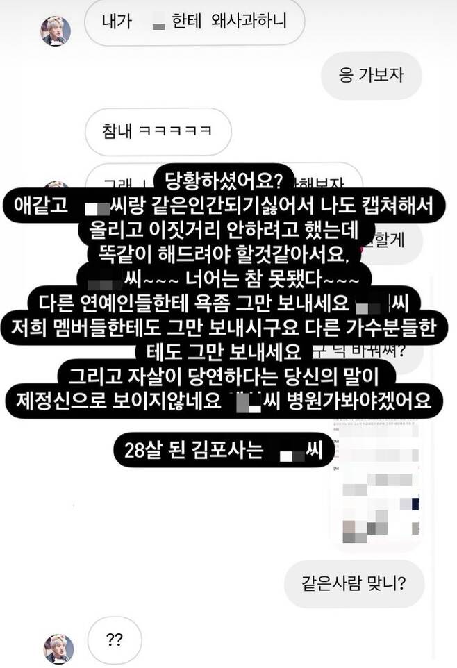 결국 리지는 그의 나이와 이름은 물론, 해당 악플러가 아이돌 팬카페에 남긴 글을 공개하기도 했다. 그는 "같은 사람이 맞나 싶네. 인격이 몇 개인지 궁금하네"라고 악플러의 실체를 공유했다. 그러면서 "자살이 당연하다니?"라며 "당황하셨어요? 애 같고 당신과 같은 인간 되기 싫어서 나도 캡처해서 올리고 이짓거리 안 하려고 했는데 똑같이 해드려야 할 것 같아서요. 너는 참 못됐다. 다른 연예인들한테 욕 좀 그만 보내세요. 저희 멤버들한테도 그만 보내시고요. 다른 가수 분들한테도 그만 보내세요. 그리고 자살이 당연하다는 당신의 말이 제정신으로 보이지 않네요. 병원 가봐야겠어요. 28살 된 김포사는 00씨"라고 일침을 가했다.