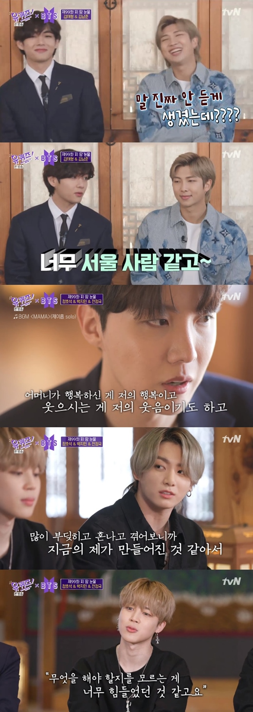 리더 남준은 “태형이 아버지가 ‘그 므시라꼬’ 라는 말을 많이 해주셔서 우리한테 슬로건이 됐다. 그게 뭐라고 경상도 사투리”라고 거들었다. 뷔는 비주얼 칭찬에 “아빠 옛날 사진 보면 아빠가 더 잘생겼다”며 흐뭇하게 웃었다.