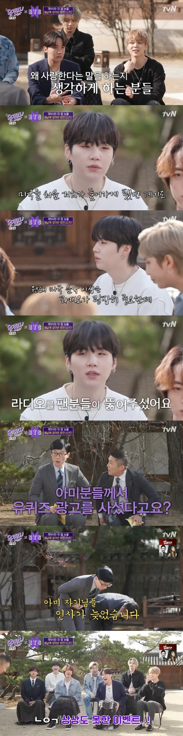 또한 슈가는 "미국에 처음 들어가게 된 계기도, 미국 시장은 라디오가 중요한데 라디오를 뚫어주셨다"라고 전했다. 정국은 "'유퀴즈' 나온 것도 아미 여러분들 덕분이다"라고 밝혔다. ‘유퀴즈’ 제작진은 MC들에게 이날 방탄소년단 팬클럽 아미가 '유퀴즈'의 중간 광고를 샀다고 밝혔다. 제작진의 말에 유재석, 조세호는 깜짝 놀라며 "감사합니다"라고 90도 인사를 했고, 이를 지켜보던 방탄소년단 멤버들은 흐뭇한 미소를 지었다.