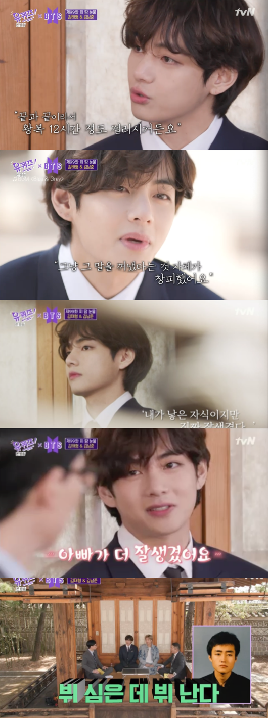 또한 방탄소년단 뷔가 아버지에 대한 애정을 내비쳤다. 뷔는 24일 오후 방송된 tvN ‘유 퀴즈 온 더 블럭’에서 “연습생 때 숙소 생활 하며 가족들을 별로 못 보는 게 제일 힘들었다. 엄마 아빠는 거제에 있었다. 왕복 12시간인데 30분 보려고 엄마 아빠가 왔다. 마음이 짠했다”고 말했다.