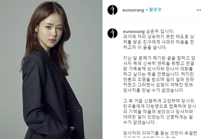 그러나 학폭을 부인 하던 심은우는 20일만에 29일 인스타그램 계정에 “과거에 내 성숙하지 못한 태도로 상처를 받은 친구에게 사과의 마음을 전하고자 이 글을 쓴다. 지난달 문제가 제기된 글을 접하고 당사자 측에 신속히 연락을 취했고 연결된 가족에게 당사자와 만나서 대화를 하고 싶다는 뜻을 전했다. 하지만 언론의 조명을 받으며 일이 일파만파 커졌고 그러면서 감정이 격해진 탓에 당사자를 만날 수가 없었다”고 적었다.