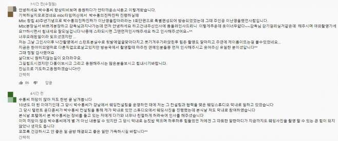 이어서 또 다른 누리꾼은  “방송 일할 때 연예인 결혼식같은 행사에 촬영 많이 갔었다. 박수홍도 자주 봤다. 6mm 카메라 하나 들고 간 어린 조연출이었다. 그냥 무시하고 지나가는 몇몇 분들과 달리 박수홍은 늘 꼬박꼬박, 정말 환하게 웃으며 카메라에 인사해주셨다. 고마웠다”라고 이야기했다. 이 외에도 많은 누리꾼이 과거 박수홍과의 미담을 풀며, 그를 위로하고 응원했다.