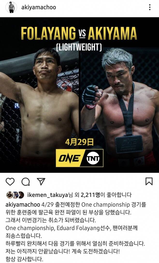 추성훈은 4일 인스타그램으로 에두아르도 폴라양과 라이트급 경기가 취소됐다고 알렸다. 그리고 부상소식을 전했다. 추성훈은 "4월 29일 원챔피언십 경기를 위한 훈련 중 발 근육이 완전히 파열되는 부상을 당했습니다. 그래서 이번 경기는 취소돼 버렸습니다. 원챔피언십, 에두아르도 폴라양 선수, 팬 여러분들께 죄송스럽습니다"라고 말했다. 추성훈은 "하루빨리 완치해서 다음 경기를 위해 열심히 준비하겠습니다. 저는 아직까지 안 끝났습니다. 계속 도전하겠습니다. 감사합니다"라고 약속했다.