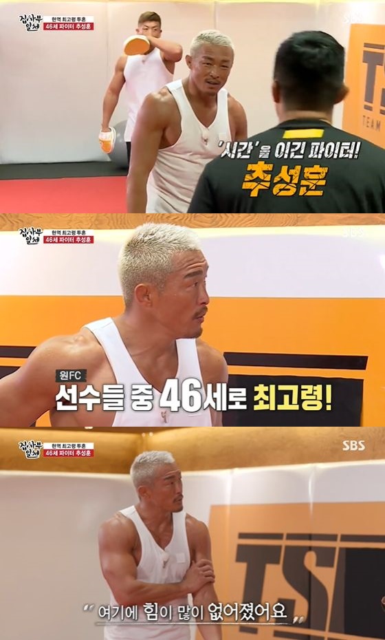 추성훈은 작년 8월 예능 '집사부일체' 추성훈이 왼팔 근육이 끊어진 부상 부위를 공개 하기도 했다. SBS 예능프로그램 '집사부일체'에는 격투기 선수 추성훈은 사부로 등장하며 당시 방송에서 김동현은 추성훈의 등장에 "우리 형"이라며 친근함을 보였지만 다른 '집사부' 멤버들은 압도적 피지컬에 가까이 다가가지 못했다. 김동현은 추성훈이 훈련 중 왼팔 근육이 끊어진 부상을 당했었다며 멤버들에 보여달라고 말했는데, 멤버들은 추성훈의 실제 부상부위를 보자 놀라움을 표했다. 추성훈은 "수술하면 복구될 수 있지만, 격투가로서 남은 시간이 많지 않다"며 격투가로서의 남다른 의지를 보여줬다.