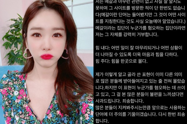 공서영은 사과문에서 "저는 메갈과 아무런 관련이 없고 사실 잘 알지도 못하며 그 사이트를 방문한 적이 단 한번도 없습니다 (메갈이란 단어는 들어봤지만 그 것이 어떤 사이트를 지칭한다는 것도 사실 오늘에야 알아습니다.) 메갈이라는 집단이 누군가를 혐오하는 집단이라면 저는 그 자체를 강력히 거부합니다"고 말했다.
