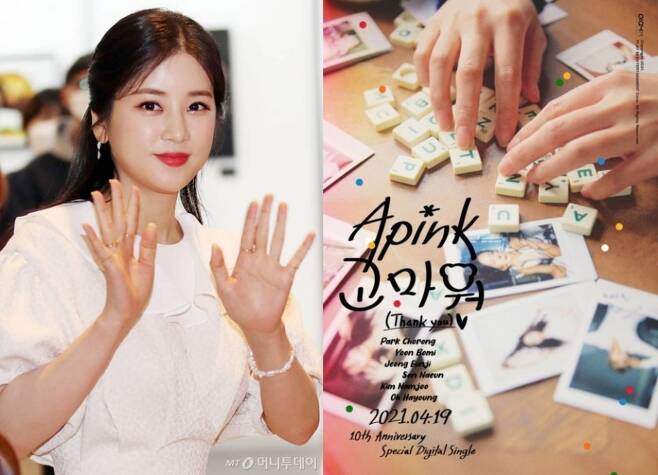 한편 에이핑크가 팬송 '고마워' 발매를 하면서 최근 학교폭력(학폭) 의혹에 휩싸인 멤버 박초롱도 이름을 올렸다. 15일 에이핑크 공식 트위터에는 "Apink 10th Anniversary Special Digital Single [고마워 (Thank you)] Image Teaser"라는 글과 함께 티저 사진이 올라왔다. 또 '2021.04.19 18:00'라는 문구로 음원 발표 시기를 알렸다. 해당 트윗은 해시태그로 에이핑크 멤버 이름을 달았다.