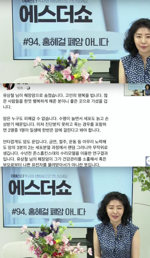 이날 여에스더는 “남편이 故 유상철이 췌장암으로 별세해 추모했다는 글을 올렸다”라고 운을 떼며 주위에서 남편이 폐암이 아니냐는 걱정이 담긴 연락을 많이 받았다고 말했다.