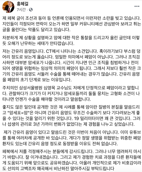 더불어 홍혜걸은 "좋지도 않은 일인데 공개한 것은 제 사례를 통해 암이란 질병의 본질을 말씀드리고 '암세포=암'은 아니며 간유리음영도 무조건 수술하기보다 기다려보는 게 좋을 수 있다는 것을 알리기 위한 것"이라며 "19mm면 꽤 큰 것이지만 섭생의 관리로 3년 가까이 변화가 없었다는 제 경험을 나누고 싶었다"고 전했다.