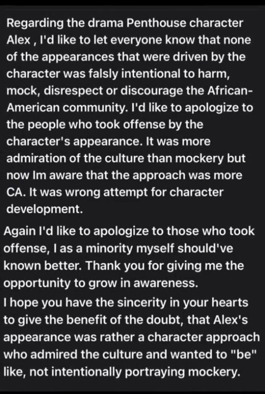 이어 "조롱이 아닌 문화에 대한 찬미였지만, 접근법이 잘못됐다는 걸 깨달았다. 그것은 잘못된 시도였다"며 "소수자인 저 자신이 더 잘 알아야 했다. 이를 깨닫게 해줘서 감사하다. 다시 한번 사과드린다"고 전했다.'펜트하우스3' 제작진은 14일 "특정 인종이나 문화를 희화화할 의도는 없었다"고 밝혔다.