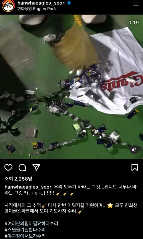 한화는 전날 대전 한화생명 이글스파크에서 열린 롯데와 홈경기에서 3-2로 승리한 뒤 구단 마스코트인 '위니'가 롯데 유니폼과 쓰레기를 함께 빗자루질 하는 영상을 게재했다.