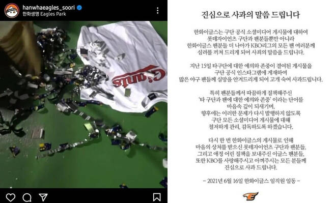 한화는 16일 구단 인스타그램을 통해 "구단 공식 소셜미디어 게시물에 대하여 롯데뿐 아니라 한화, KBO 리그의 모든 팬들께 심려를 끼쳐 드리게 돼 사죄의 말씀을 드린다"고 사과했다. 이어 "타 구단에 대한 예의와 존중이 결여된 게시물을 구단 공식 인스타그램에 게재해 많은 팬들께 실망을 안겨드렸다"고 전했다.