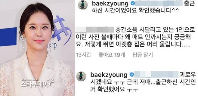 층간 소음을 지적하는 댓글에 백지영은 "출근하신 시간이었어요 확인했습니다"라고 답글을 남겼지만 누리꾼은 "몇 층 아래까지 울린다"고 반박했다.