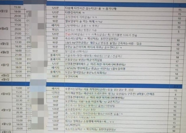 공개된 엑셀 파일에 따르면 이씨는 조씨와 함께 1인 유사 성매매 업소를 운영했다. 실제로 엑셀 파일에는 손님들의 방문 날짜와 시각, 서비스 종류 등이 적혀 있다.