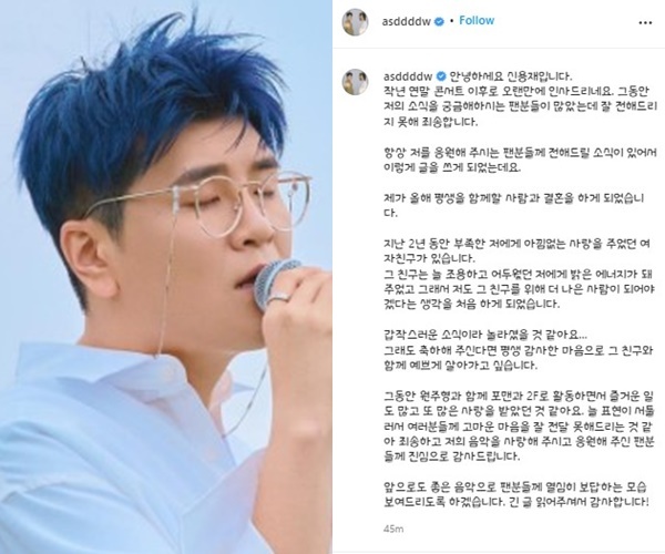 "지난해 연말 콘서트 이후로 오랜만에 인사드린다"는 신용재는 "그동안 저의 소식을 궁금해하시는 팬분들이 많았는데 잘 전해드리지 못해 죄송하다"며 장문의 글을 시작했다. 그는 "제가 올해 평생을 함께할 사람과 결혼을 하게 되었다"며 깜짝 결혼 소식을 전했다.