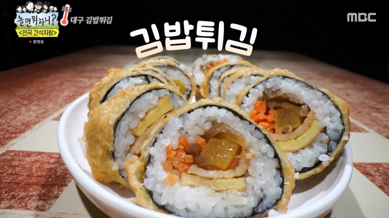 그리고 세 사람은 대구 납작만두 가게가 있는 시장에 도착했다.애피타이저로 납작만두와 떡볶이를 맛본 세 사람은 주인공 김밥 튀김이 나오자 군침을 삼켰다. 정준하는 “큰 김말이인데, 당면이 아니라 밥알이 들어있다”라고 표현했고, 이미주는 “이건 진짜 레전드다”라며 감탄했다. 유재석은 “(제보해주신 분이) 왜 이야기하셨는지 알겠다”라며 발을 동동 구르며 물개 박수를 쳤다.