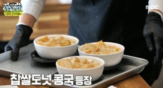 유재석과 이미주, 정준하는 대구로 향했다. 앞서 지난 21일 방송된 '놀면 뭐하니?'는 '전국 간식 자랑' 특집으로 꾸며졌고 찹쌀도넛 콩국이 대구 간식으로 지목됐다. 담백한 콩국에 찹쌀 도넛을 먹기 좋은 크기로 잘라서 넣어 먹는 것이 특징이다.