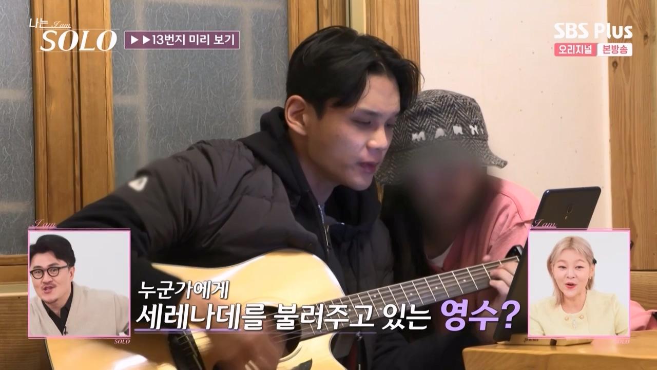 13기 첫번째 남자 출연자 영수는 음악을 좋아하는 통기타 가수? 직업은 피부과 의사 혹은 다른 의료쪽이라는 말이 있지만 어떤 분야인지는 모른다. 나이는 30대로 추정 사전 인터뷰에서도 가장 오픈이 덜 되었다. 아직 많은 정보가 없다. 다음주 자기 소개에서 정확하게 나올 듯 하다. 그리고 그의 노래를 옆에서 듣고 있던 여자가 누구인지 궁금해 하고 있다. 영자 현숙 등으로 추정하고 있다. 두번째 남자 출연자 영호는 30대 대기업 회사원으로 사전 인터뷰를 보면 괴짜 캐릭터 느낌이다. 세번째 남자 영식은 한체대 출신의 엘리트 체육인으로 국가대표 경력이 있다 역도 선수라는 말이 있다.