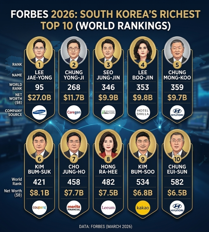 2026년 3월 10일(현지시간), 포브스가 제40회 세계 억만장자 리스트를 발표했습니다. 올해 전 세계적으로 3,428명의 억만장자가 탄생한 가운데, 대한민국 부호들은 총 45명이 명단에 이름을 올렸습니다.